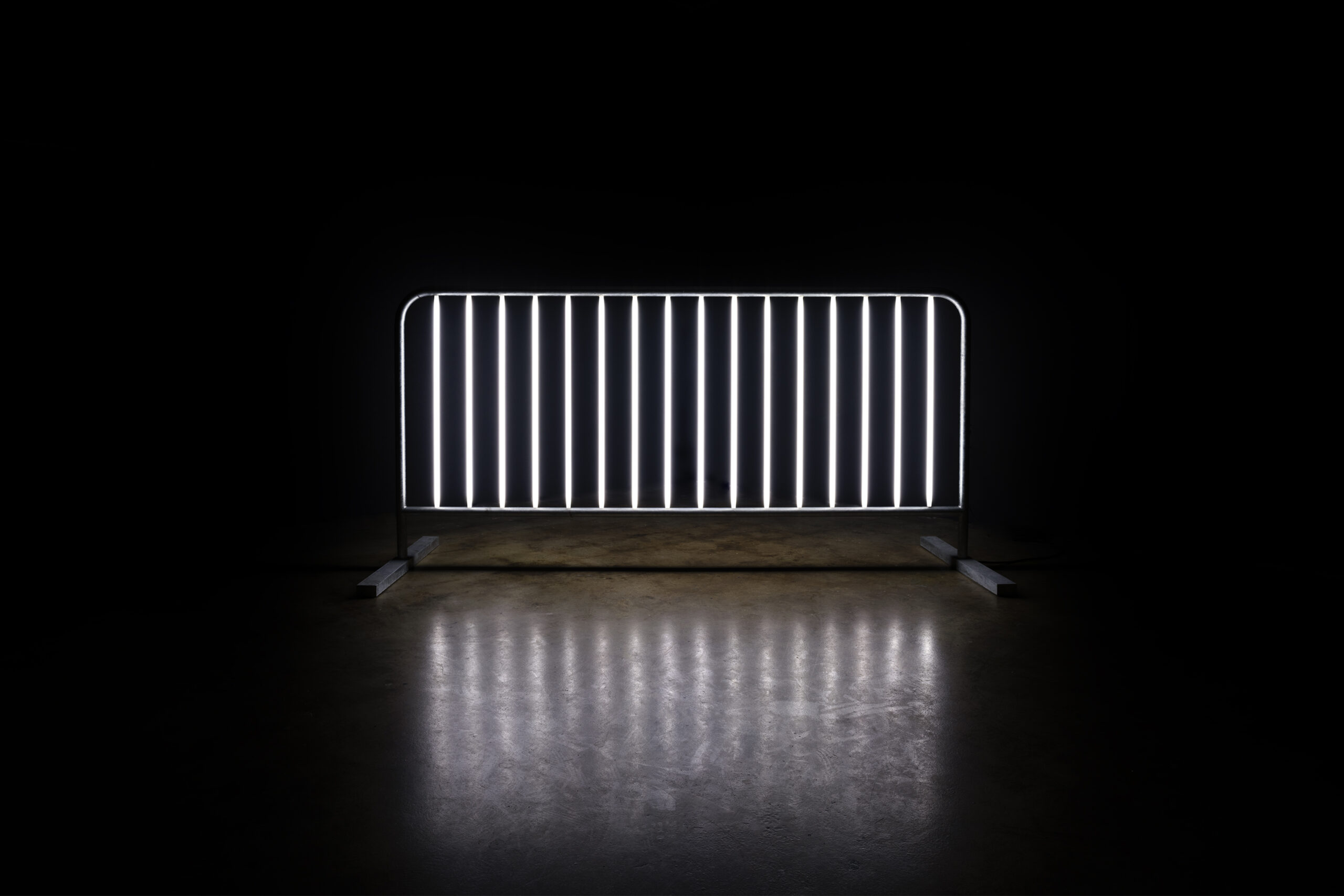 Where there is power, there is resistance is part of a series of works in which Ruben Millares and Antonia Wright explore the sculptural and symbolic potential of standard steel barricades. Though more often associated with crowd control at celebratory events like parades and concerts, these generic objects have recently come to bear heightened connotations related to mass protest and state power. Since last summer, authorities throughout the world from Hong Kong to Chile have deployed them extensively to contain and control protestors, including the large crowds that turned out in defense of Black lives in the wake of the killing of George Floyd. Barricades also played an infamous role on January 6, 2021, buckling under the weight of the angry mob that stormed the U.S. Capitol in a failed attempt to block the ratification of the presidential elections. By replacing a barricade’s vertical bars with fluorescent lights, the artists neutralize its function, making it easy to shatter. Moreover, barricades rely to a significant extent on their own innocuousness, directing the passage of bodies through urban space in an almost subliminal manner. By transforming the object into a thing of conspicuous beauty, the artists abrogate these insidious psychological operations.
